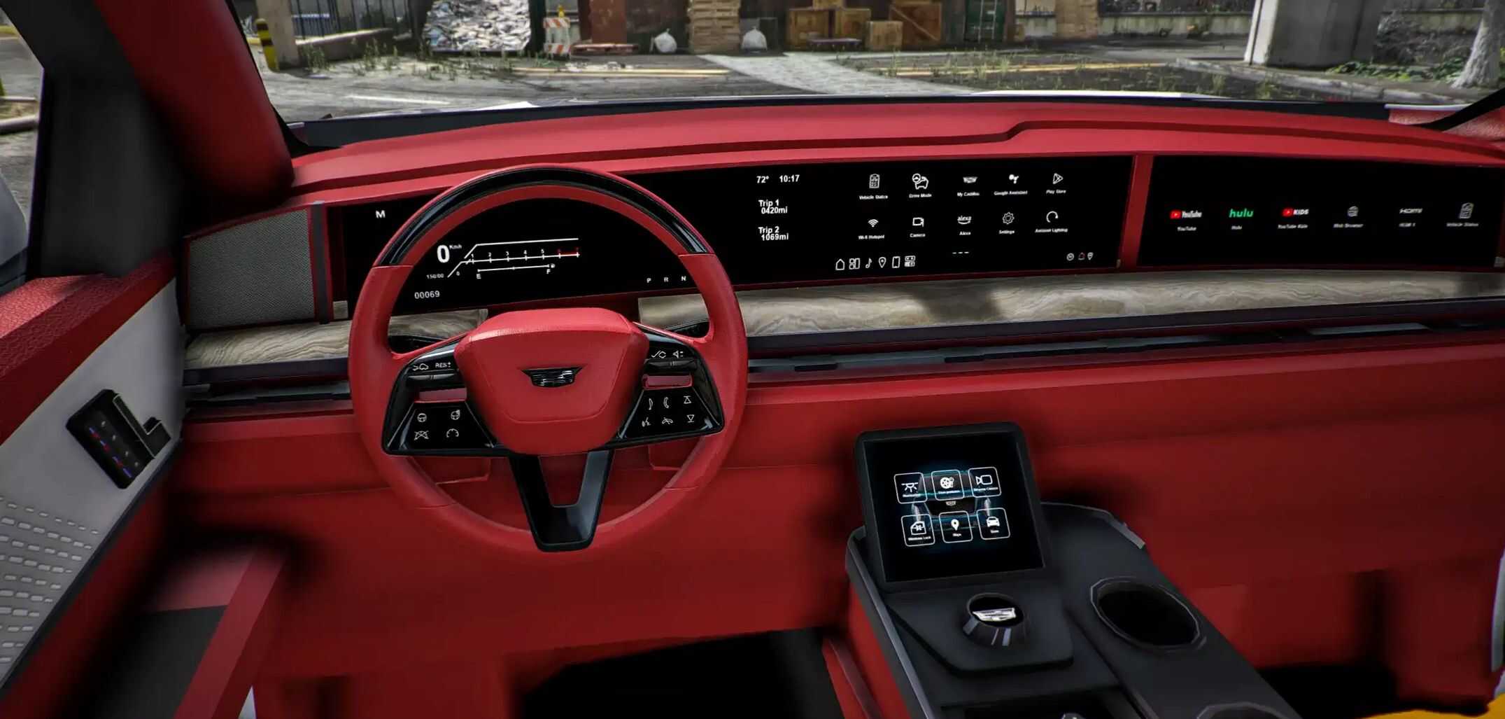 – Huge chrome wheels with a unique pattern and low-profile tires dominate the look, highlighting its connection to custom car culture.