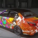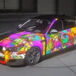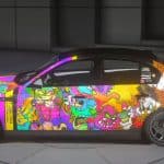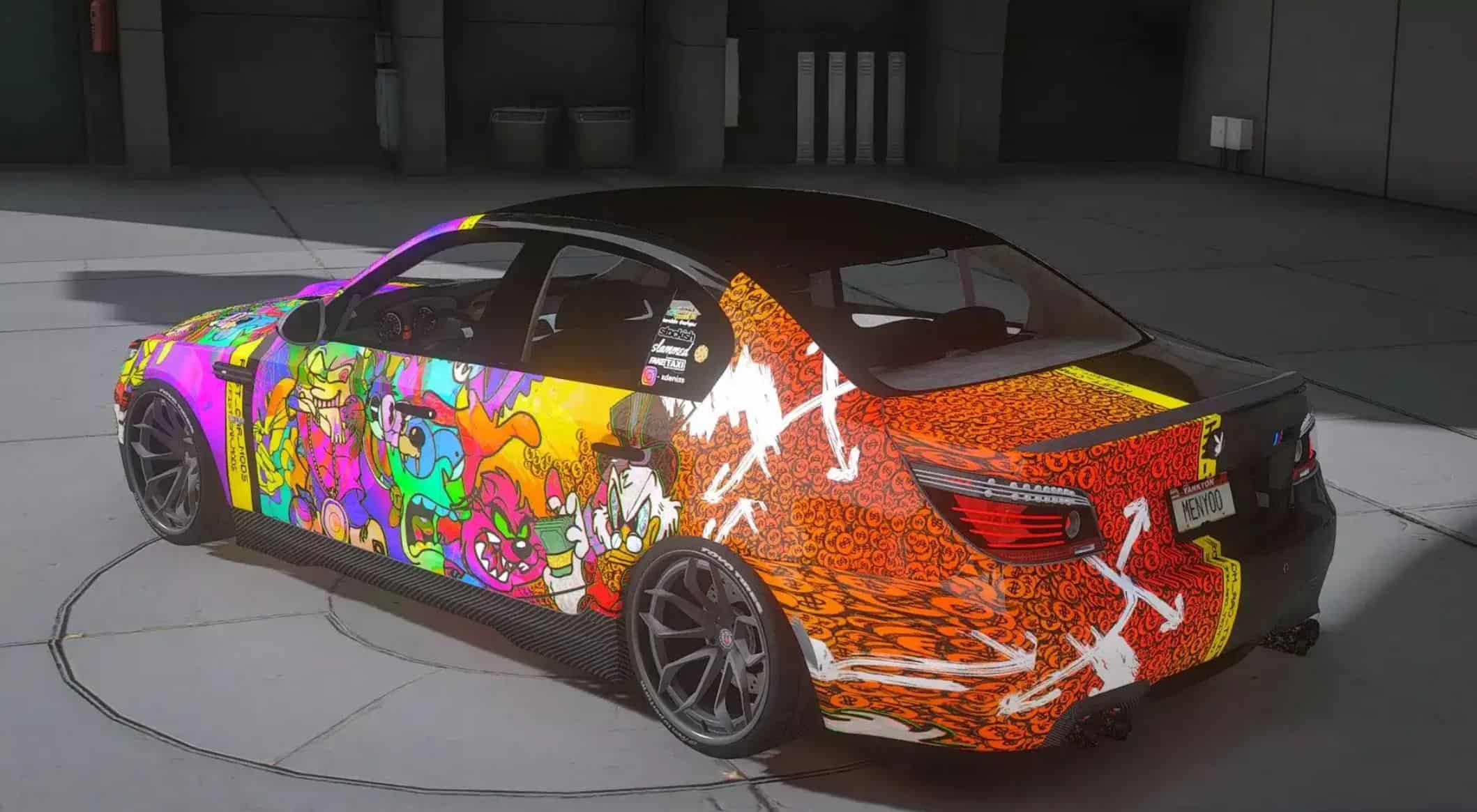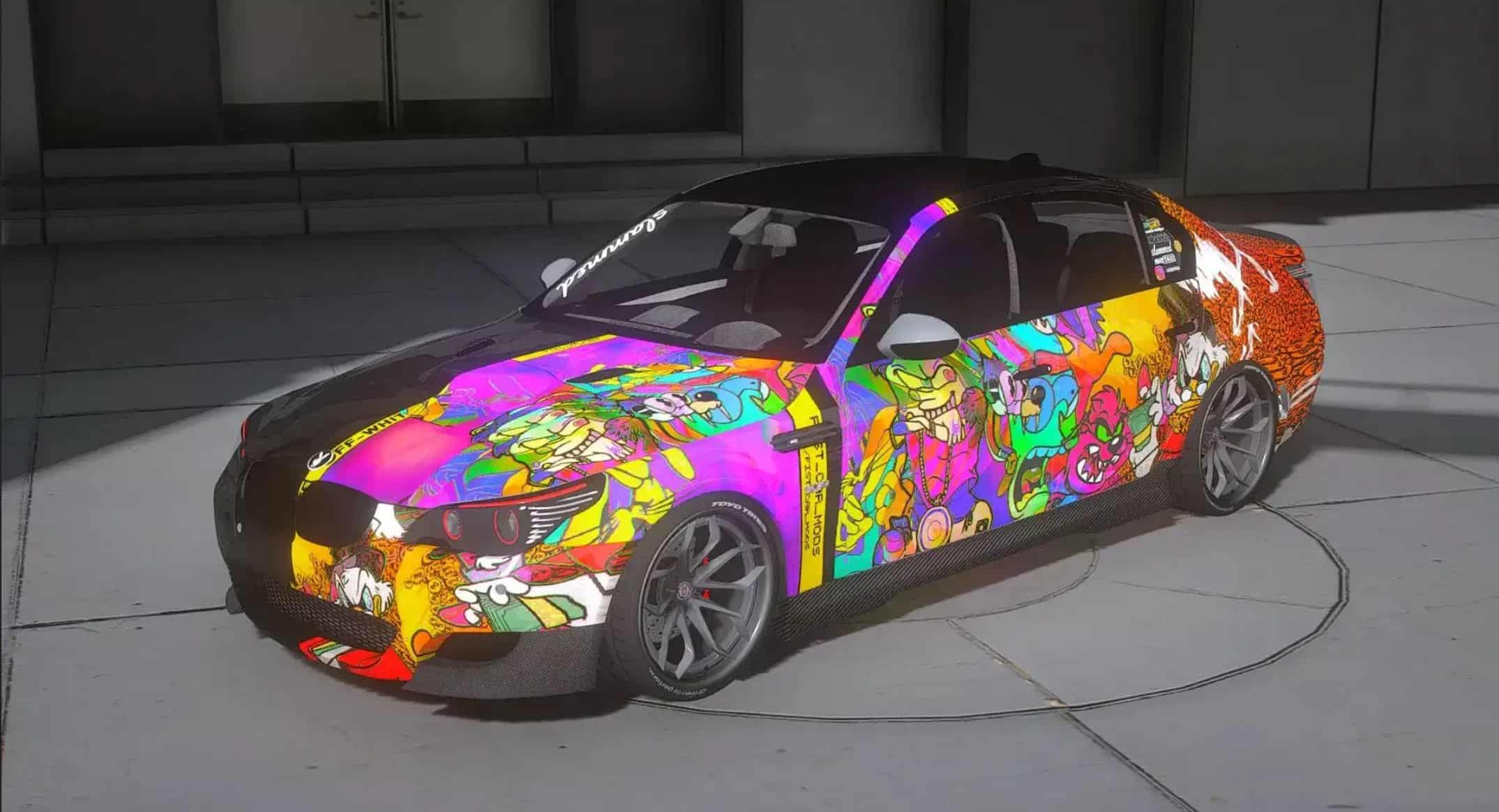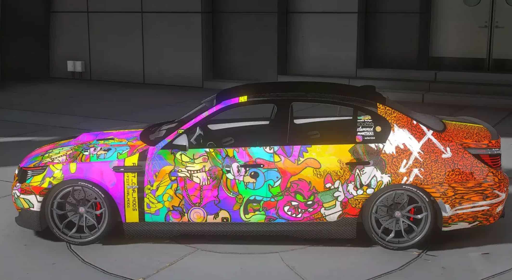 – The hood is decorated with bright street art graphics, instantly making the car stand out in traffic and giving it a bold character.
