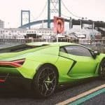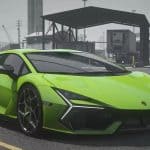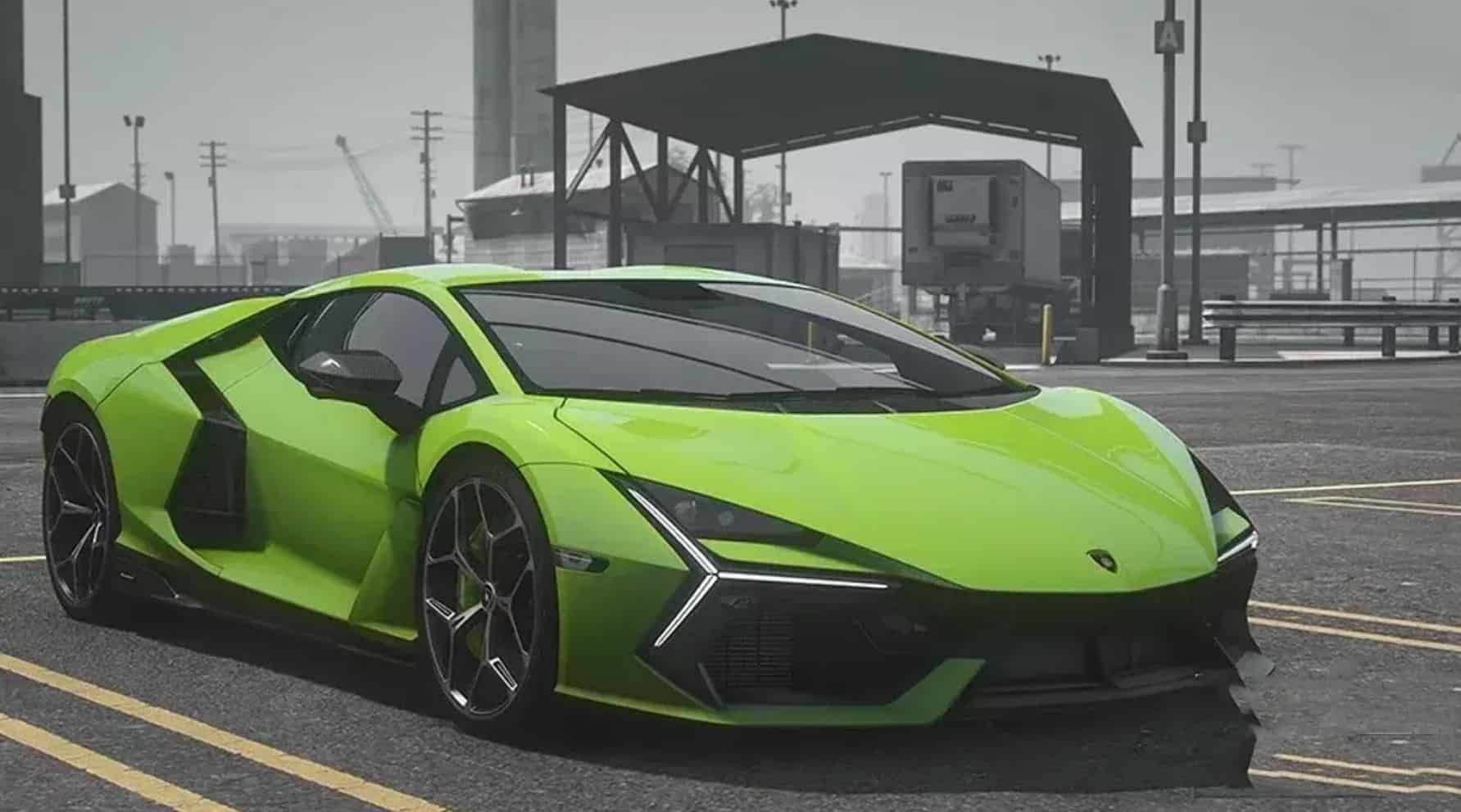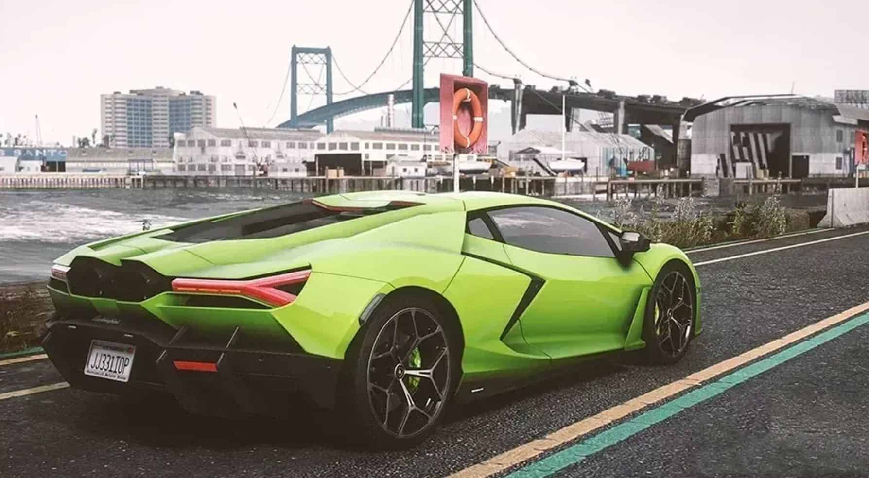 Black accents and sharp shapes complete the image of the ultra-modern hypercar Lamborghini Revuelto 2024.