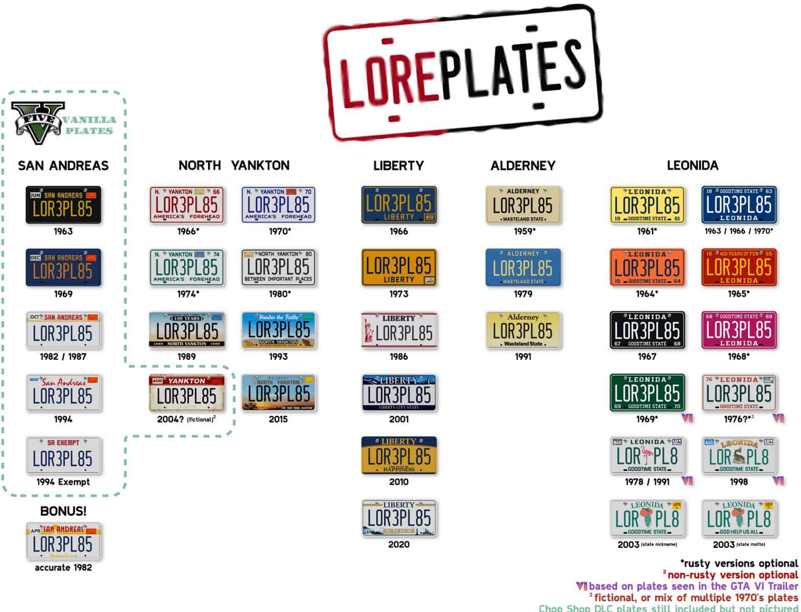 The default San Andreas license plates in GTAV are based on the standard issue California plates from the past sixty years. LorePlates is a collection of additional license plates from the same timespan, for the four other fictional states in the GTA Universe: Leonida, Liberty, Alderney, and North Yankton. (based on Florida, New York, New Jersey, and North Dakota respectively). Each plate in this pack is a painstaking recreation of a real-life counterpart, combined with a conscious effort to emulate Rockstar’s satire. If Leonida, Liberty, Alderney, and North Yankton were fully accessible in GTAV, then LorePlates is an estimation of the kind of plates Rockstar would make for these regions.