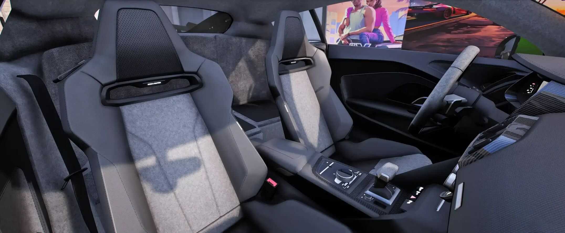 – The hood is made of matte carbon fiber and adorned with a bright lime accent stripe, giving the car an aggressive and ultra-modern look.