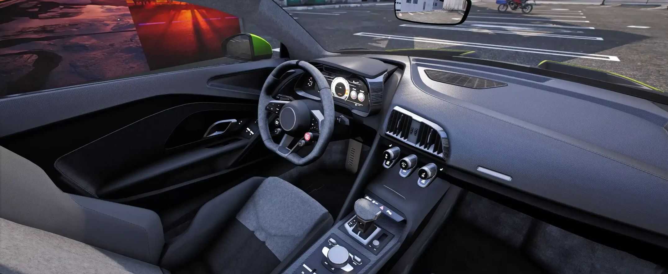 – A massive front bumper with carbon and lime inserts, along with complex aerodynamics, highlights the car’s racing character.