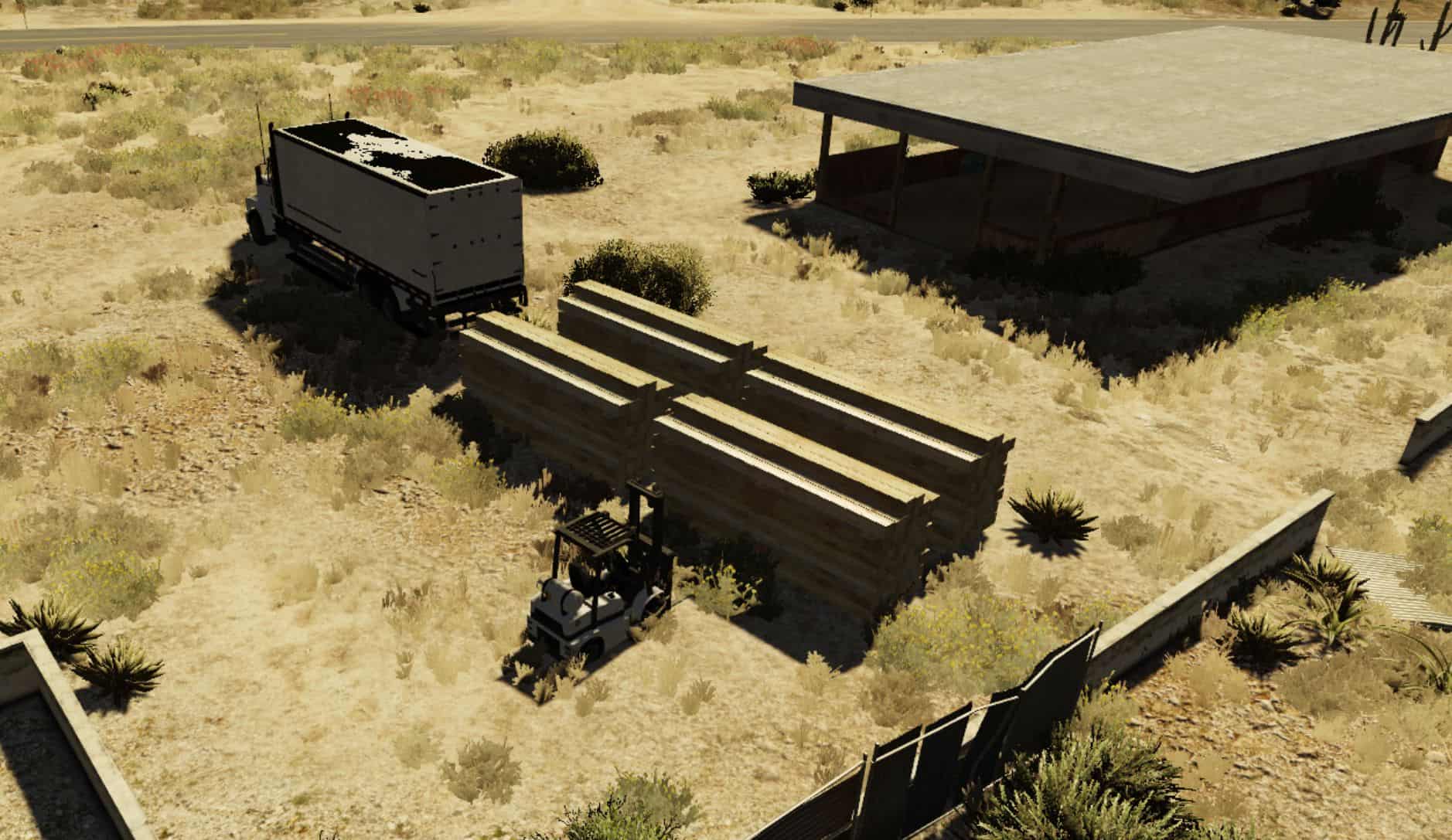 A variety of construction vehicles, including dump trucks and bulldozers, have been added around the motel site to enhance the realism and activity of the scene.