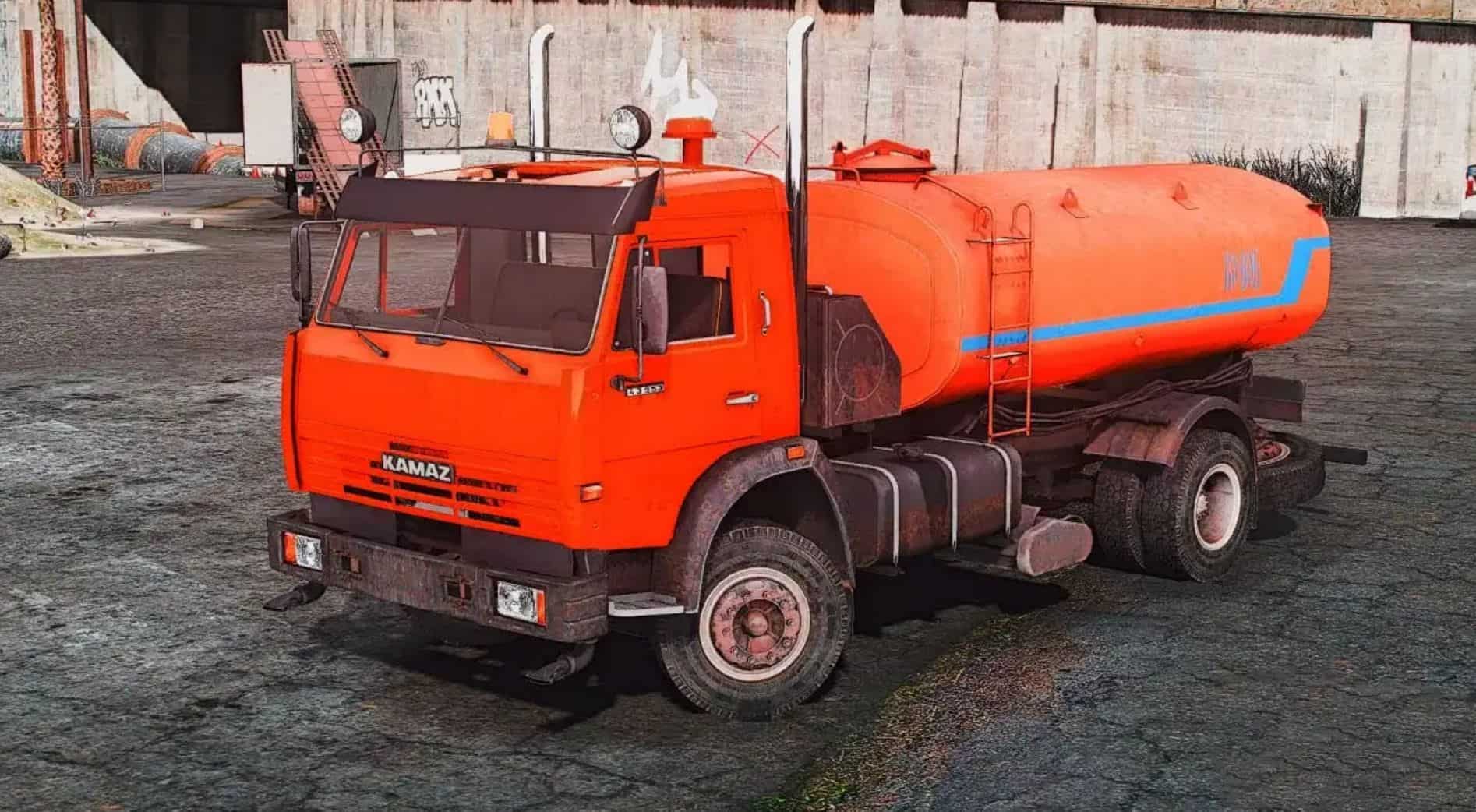 Watering KAMAZ 43253 for GTA 5. The body and interior of the model are well detailed. The car fits perfectly into the game!