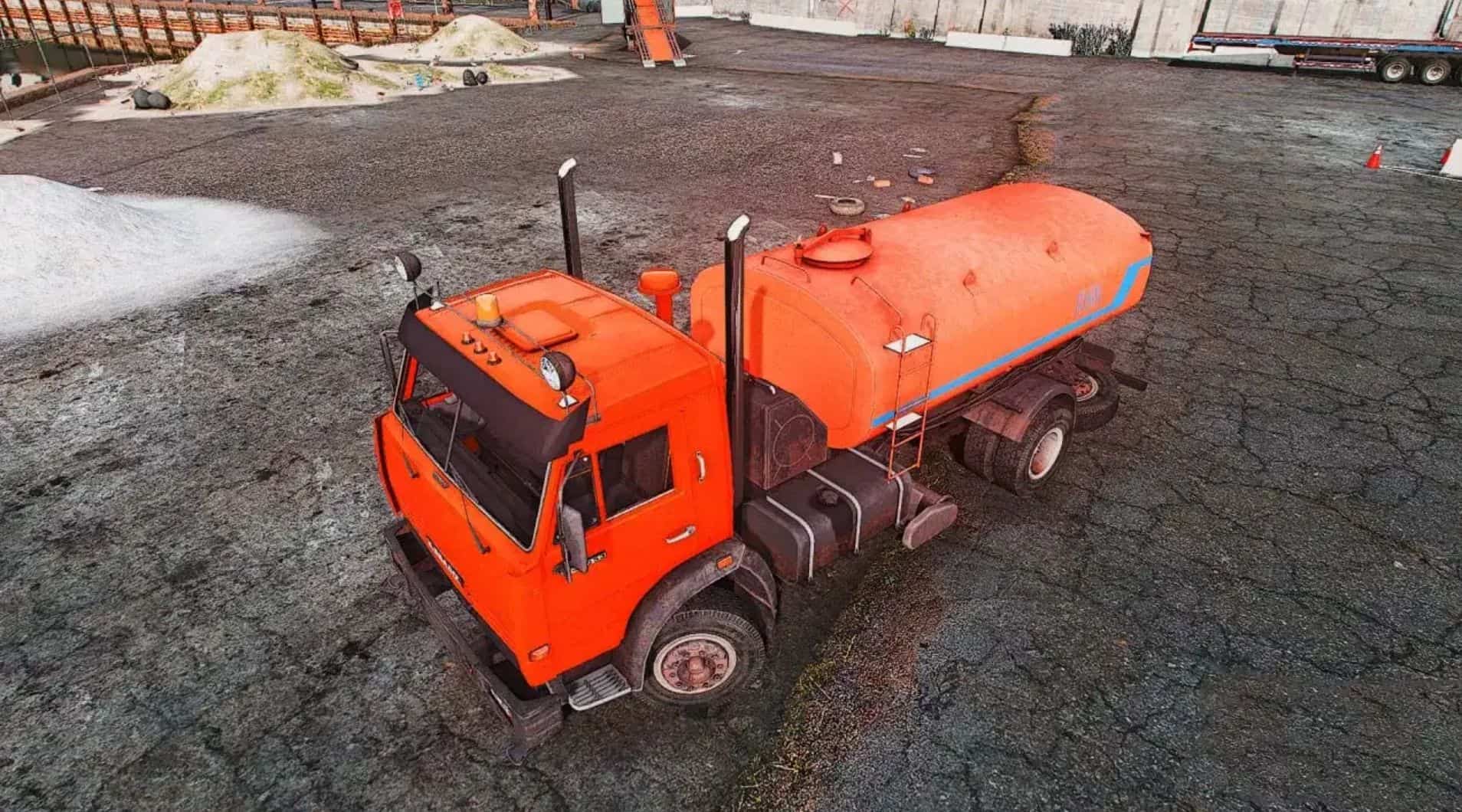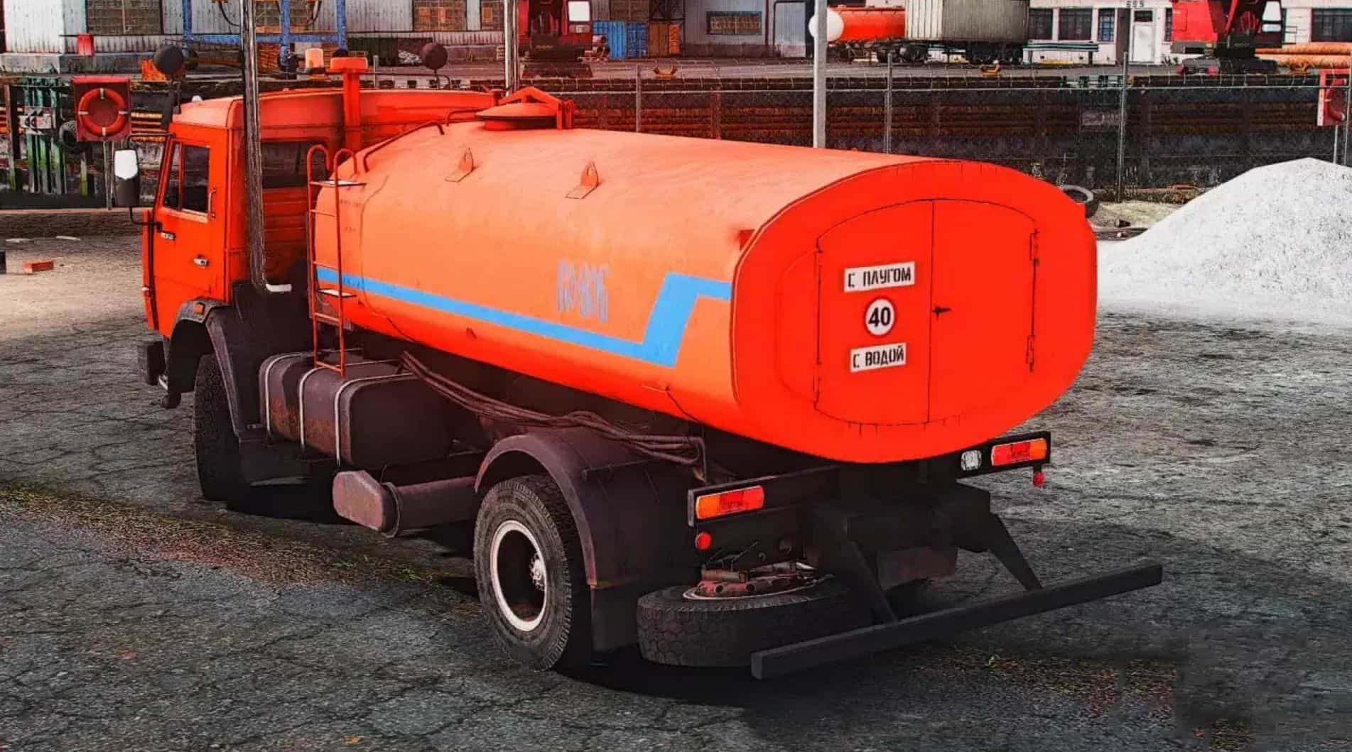 Watering KAMAZ 43253 for GTA 5. The body and interior of the model are well detailed. The car fits perfectly into the game!
